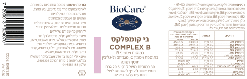 - ויטמינים B1 B2 B3 B4 B5 B6 ו – B12 בצורות הפעילות הביולוגית שלהם, מה שמבטיח יעילות מיטבית.