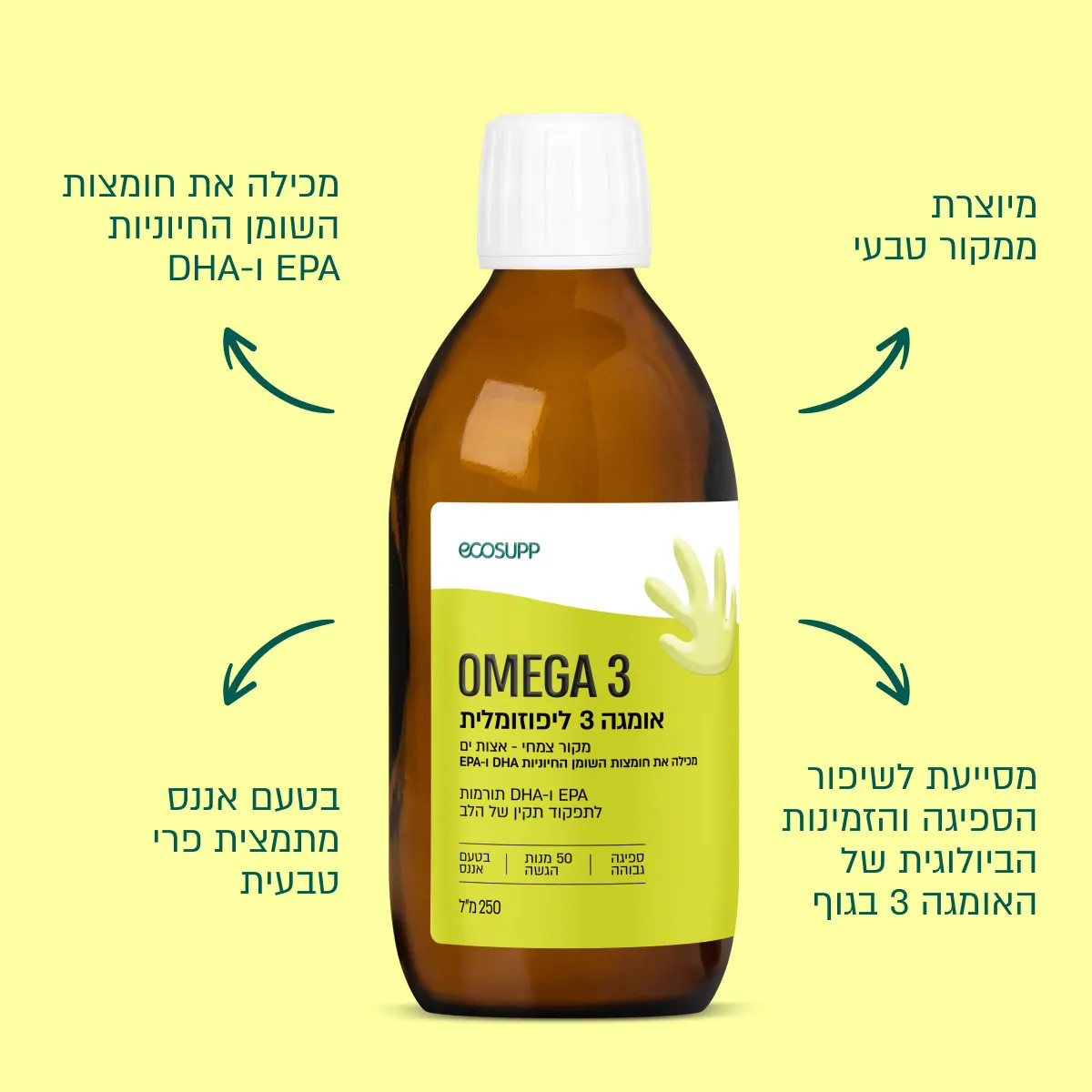 הליפוזום מגן על האומגה 3 מפני חומציות הקיבה ומסייע לה להיספג במעי – משם היא מועברת למחזור הדם. - מכילה את חומצות השומן החיוניות EPA ו-DHA.