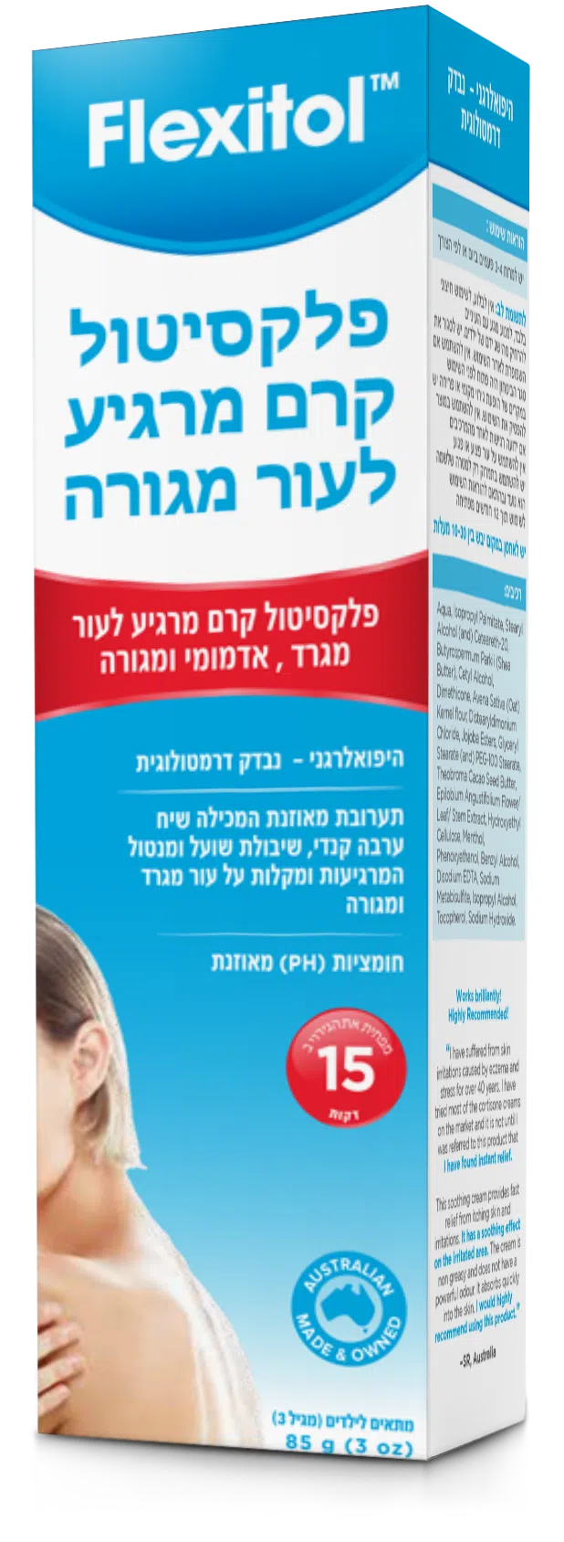 לקרם מנגנון פעולה משולש ייחודי, המכיל תערובת שיח ערבה קנדי, שיבולת שועל ומנטול המקלים ומרגיעים עור מגרד, אדמומי ומגורה. • הקרם מספק הזנת לחות עשירה • מפחית את הגירוי תוך 15 דקות • ללא פטרולטים ופרבנים • בעל חומציות (PH) מאוזנת פלקסיטול קרם מרגיע לעור מגורה מספק פתרון יעיל, מהיר ובטוח לבעיות הקשורות לעור יבש,מגורה ומגרד. במחקרים השוואתיים נמצא כי הקרם מראה יעילות דומה למשחת קורטיזון 1% וג’ל אנטי היסטמיני בהקלה על תסמיני גרד, אדמומיות ונפיחות בטווח קצר. הקרם מתאים למבוגרים ולילדים (מגיל 3)