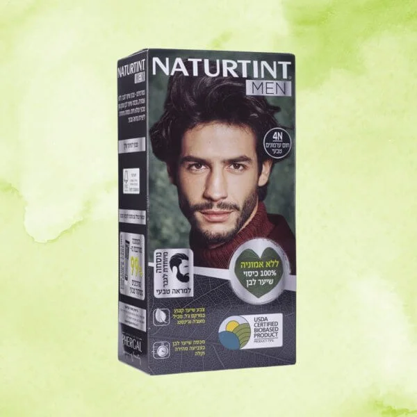 צבע השיער נטורטינט Naturtint Men 4N בגוון חום ערמונים טבעי הוא צבע קבוע המיועד במיוחד לגברים, להענקת כיסוי מלא של שיער שיבה בשיער הראש, בזקן ובשפם. הפורמולה הייחודית מבוססת על רכיבים טבעיים, ללא אמוניה, ומעשירה את השיער בלחות וברק.